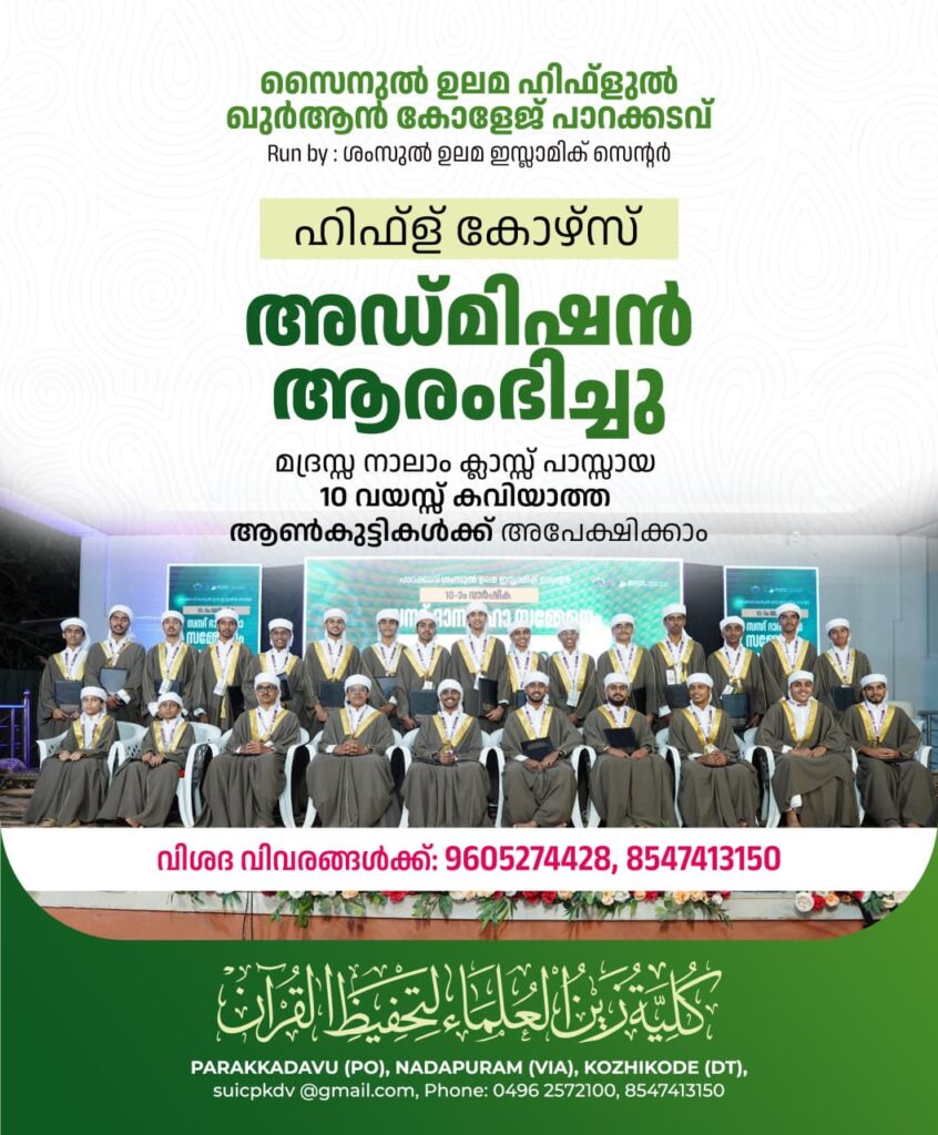 The Shamsul Ulama Islamic Centre in Parakkadavu, established in 2015, is a prestigious educational hub dedicated to promoting Islamic education, spiritual development, and community engagement. Established in the name of the great scholar, Shamsul Ulama E. K. Aboobacker Musliar, our prime motive is to generate well-rounded young men and women—scholars and laymen—who are equipped to represent Islam and its values effectively within a pluralistic society. We achieve this through our commitment to comprehensive religious and academic excellence, youth empowerment, and active social service.
